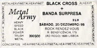 From Barreiro, Setúbal came Black Cross. Formed in 1985 by bass player João "Francês" Ramos (ex-Air Force) who contacted guitarrist Paulo Henrique to form a Heavy Metal band, Black Cross. João contacted another friend, Filipe "Bombas" who took the drums. After a period of several months with rehearsels and looking for a vocalist, Paulo Henrique leaves the band for personal reasons. Reduced to a duo the group continues rehearsing and by this time follows the acquisition of the new vocalist, Quim. The guitars are secured through the help of Toninho (Asgarth /Ibéria). On December 20th 1986 Black Cross played their first concert, at the Rock Rendez Vous venue. Soon after Quim quits the band and enters Ginha. With him, they try to record a demo tape, but that never happens. Ginha eventually leaves the band. They find a new replacement, Rui "Destruction" Subtil. They contact with Ronnie James Dio to collaborate in the project Hear n`Aid, Dio`s response to them was that he would gave all the support for organizing a concert featuring Portuguese Heavy Metal acts, whose funds would accrue to Hear n Aid project. In this context of euphoria they eventually recorded their 1st demo tape, with the tracks: "Genocidio", "Heavy Metal", "Sexta Feira 13", "Minotauro" and "Chamamento Para a Morte". In the beginning of 1987 the line up consisted in João "Francês" Ramos bass, Filipe "Bombas" drums, João "Relâmpago" solo guitar and Adalberto "X" vocals (performed only one gig with Black Cross). Soon after, Rui Subtil returns to the band. On March 20th they performed live at a festival organized by Radio Márgem Sul, before 1,500 people. The festival was broadcasted live on radio. Meanwhile the group is invited by RTP (National Television Channel) to record a short advertising spot against drugs, "Não! á dependência" (No to dependence). In March both guitarrists leave the band to pursue a solo career. Enters Rui Fingers (V12) and ensures all the guitars until the end of the band. Black Cross were one of eight bands, together with Tarantula, STS Paranoid, Procyon, Navan, Satan`s Saints, Devil Across and Blizzard, to enter the sessions for the first Heavy Metal double album, live at the Rock Rendez Vous, June 10th 1987, but that never materialized. During their performance in July 18th 1987 at the Ferroviários pavilion, Barreiro, singer Rui Subtil breaks a knee. Black Cross split up in the summer of 1987. The main reason came from the bassist João Ramos, who tired of the band's situation in the national metal scene, including the relationship with other bands, decided to leave the group, and consequently finished the project. The band farewell concert was in Vila Nova de Mil Fontes, July 31th 1987.demo tape "Sexta Feira 13" ©1987 Metal Killers fanzine