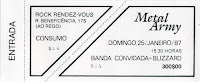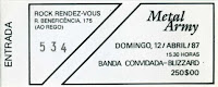 Heavy Metal band from Algés, Lisbon formed in 1983. It was considered a reference in its genre by the impact of their concerts, fireworks displays and for their shocking and unforgettable live performances. First line up was Pedro Sousa vocals/ bass, Luís Marques (Bola) guitar, Luís Filipe guitar and Pedro Barroso drums. With this line up Blizzard played live for the first time around 1983 at a private party. "Mercado Negro", "Só Tu" were part of their repertory, sung in Portuguese. They eventually win the Festival de Verão in Paço D´Arcos with the song "Mercado Negro". The 2nd line up was Paulo Boto vocals, Ilídio Praia drums, Pedro Azevedo bass and guitarrists Luís Filipe and Luís Marques (Bola) and Fernando Pires keyboards. In early 1987 Luís Marques (Bola), Ilídio Praia and Pedro Azevedo leaved the band in order to transition to another project. With a 3rd line up, consisted in Paulo Boto vocals, Luís Filipe and Luís Moreno guitars, Pedro Santos drums and Rui bass they recorded a 6 track demo which included "Blondie One", "Tormentor", "Angels Retiring", "Back To Hell", "Metal Advice" and "Time To Rock". Blizzard were one of eight bands, together with Tarantula, STS Paranoid, Procyon, Navan, Satan`s Saints, Devil Across and Black Cross, to entered the sessions for the first Heavy Metal double album, live at the Rock Rendez Vous in June 27th 1987, but that never materialized. They split in 1988. Blizzard met in 2006 for a single concert, 20 years later, with the presence of a considerable number of fans, friends and guests, the line up was: Paulo Boto vocals, Ilídio Praia drums, Pedro Azevedo bass and guitarrists Luís Filipe and Luís Marques (Bola).