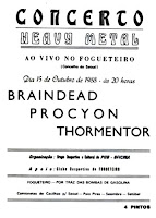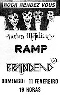 Braindead came from Almada on December 1987, by guitarrist Nobre and vocalist Michael. A few weeks later joins the group drummer Marco Franco. Only in April 1988 they found a bass player: Miguel Fonseca. Still in April they recorded their first demo tape, entitled "The Final Judgement", that included 4 tracks: "Trapped In Solitude (Intro)", "Warriors Of Pain", "Mortal Malignance" and "Bloody Nightmare". On June 9th 1988 they played their first gig at the Secondary School of Cacilhas, Almada, and their 2nd in July 1st, Fogueteiro at the "festivity of friendship". Finally in September they recorded their 2nd demo tape "The Human Remnants of..." which included 3 tracks "Winds Of Insanity (Intro)", "Hedonist Grimace" and "Peroxide". With this demo tape made Braindead one of the most promising national bands. October 15th 1988, the group played with Procyon, Thormenthor and The Coven in Fogueteiro. April 1989 Michael and Marco leaved the band due to musical differences. But a few weeks later they returned, the line up was: Michael vocals, Marco drums, Nobre guitar, Vasco guitar and the new member Nuno Espírito Santo bass replacing Miguel Fonseca, who had joined Thormenthor. Numerous live concerts in 1989 and some at the Rock Rendez Vous venue. Already in 1990 drummer Marco leaves the band to join Massive Roar. The band splits and re unites without the original drummer in 1992 but changed their style to funk, rap/ Metal.
