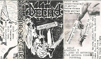 From Parede, Lisbon, came the Black/ Thrash Metal band Decay. Formed by two friends, J. A. guitar/vocals and Nuno guitar, on August 1990. With the collaboration of Pedro drums and Carlos bass, the first rehearsals took place in September. In October Jorge (Cunnilingus) joins in as vocalist. In December the band recorded their 3 track promo tape, with the songs "No Tomorrow", "Our Existence" and "Too Fast!" and in the same month they played their first gig in Parede, December 16th. A 2nd gig is held in Santarém, March 17th 1991 and soon Pedro and Jorge leaved the band, being replaced by Mike (Moonspell) and João (Moonspell, Grog, Ironsword) respectively. It is around this time that they changed the name to Decayed.thanks to J.A.