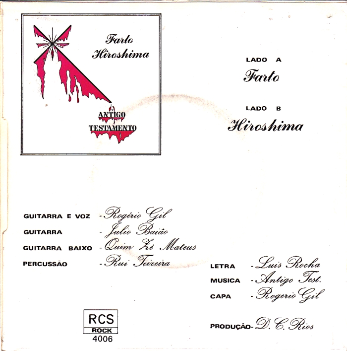 Antigo Testamento emerged with the Portuguese Rock boom in the beginning of the 80s, and only released the 7" single "Farto/ Hiroshima" around 1982. The line up was Rogério Gil vocals/ guitar, Julio Baião guitar, Quim Zé Mateus bass and Rui Teixeira drums.